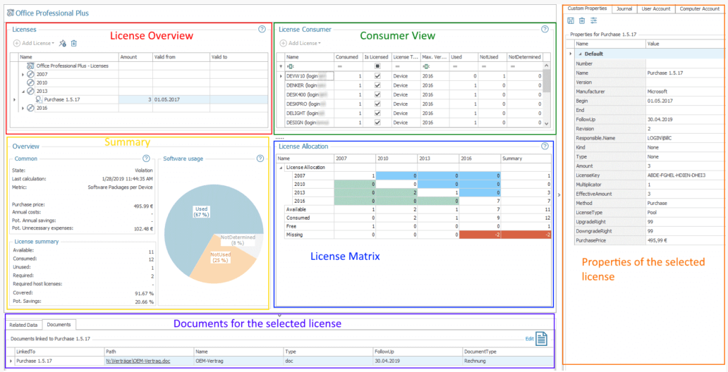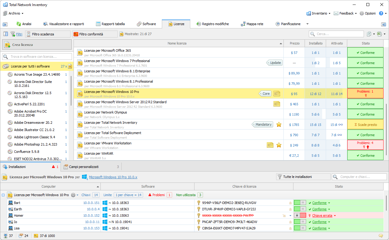 Va oltre l'inventario di base per abilitare flussi di lavoro realmente olistici di gestione del software e delle licenze. È possibile replicare accordi di licenza reali con definizioni granulari - specificando dettagli di acquisto, scadenza, conteggi di installazione, chiavi disponibili, ecc. per riflettere gli stati di conformità live per licenze perpetue, contratti volume e bundle multi-prodotto complessi.