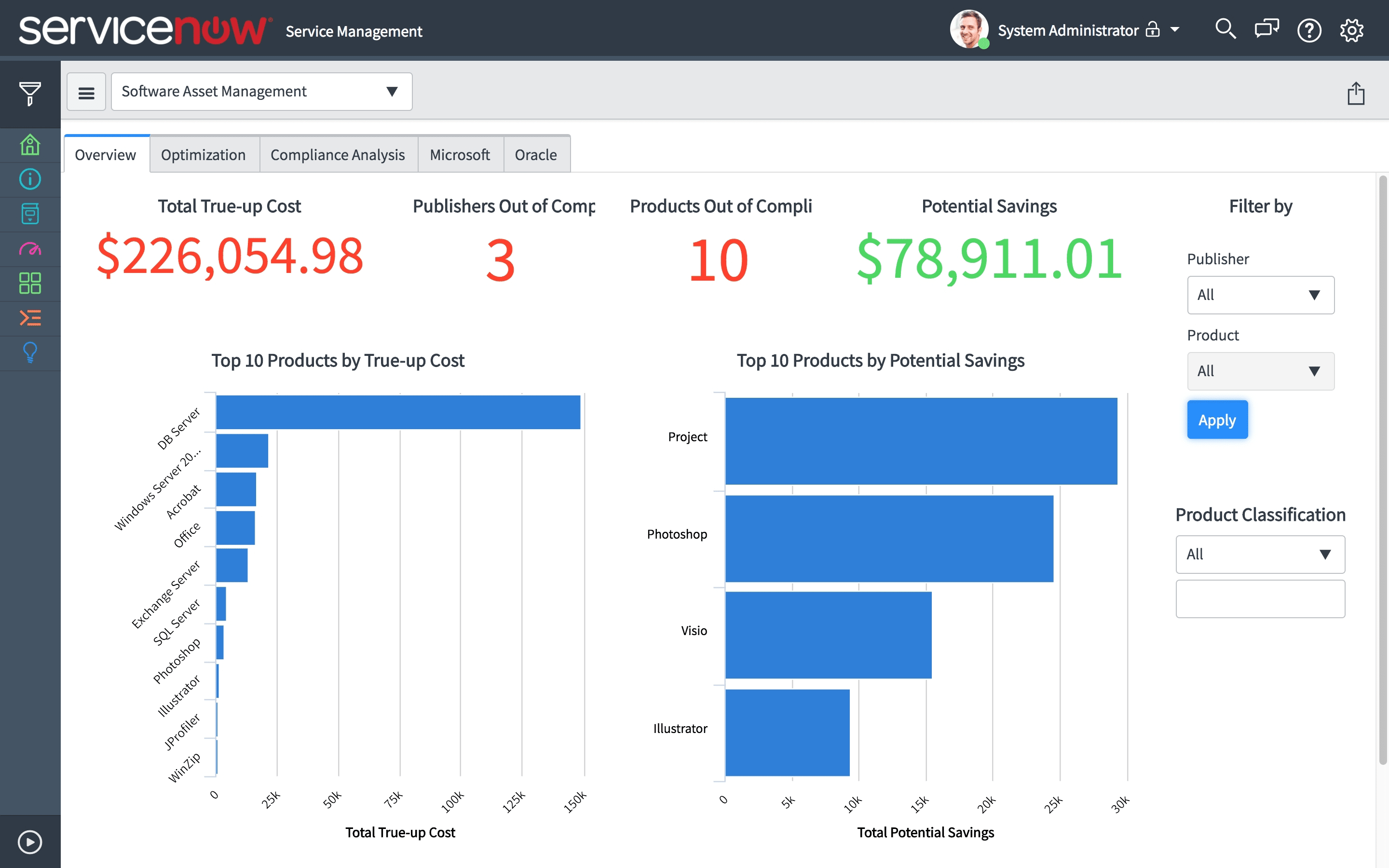 ServiceNow IT Asset Management offre visibilità e governance di prim'ordine sulle risorse software aziendali - da una console cloud centralizzata. Dashboard personalizzati forniscono analisi azionabili sfruttando dati di utilizzo correlati, previsioni di spesa e stati di conformità.