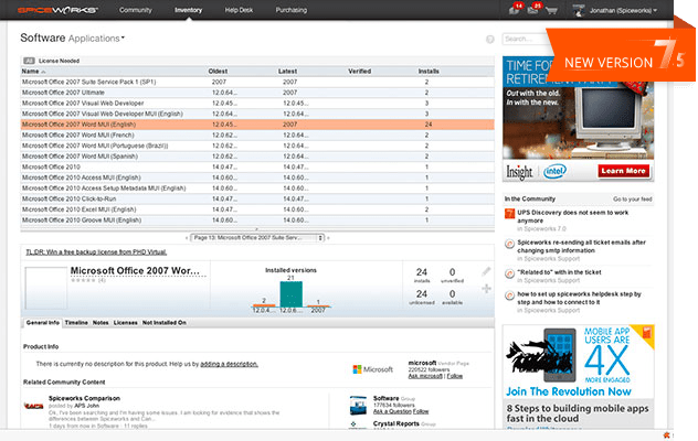 Spiceworks Network Inventory offre le migliori capacità di audit software finanziate dalla pubblicità display. Scopre automaticamente i dispositivi in ambienti Windows, Mac e Linux per creare un catalogo centralizzato delle macchine documentando le specifiche hardware installate, le applicazioni, gli eventi e le modifiche.